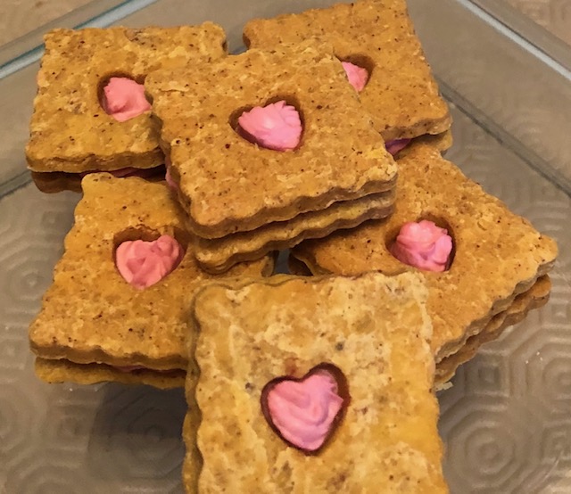 Shadow’s peanutty butties are made with grain/gluten free flour, sandwiched together with doggy safe icing. Our peanut butter is 100% peanuts and does not contain xylitol or palm oil.